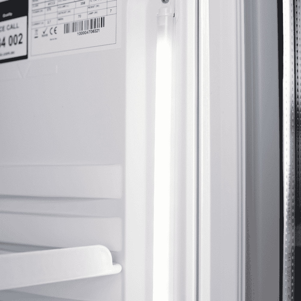 The fridge is suitable for storage of perishable drinks and food, with 3M1 climate class. | Reduce your energy consumption and operating costs with an incredible 9-star GEMS rating. | With 5 adjustable shelves, you can easily customise the layout to accommodate drinks or items of different sizes and shapes. | High-impact LED internal lighting on each side ensures that your products are perfectly illuminated, making them look their best and enticing customers to make a purchase. | The double-glazed glass self-closing doors reduce heat keeping condensation at bay and ensuring your products are clearly visible. | Powered by a powerful fan-forced refrigeration technology, the fridge ensures even distribution of cool air, keeping your products uniformly chilled. | Thanks to castors, you can easily move and position the fridge wherever it best suits your floor layout. |