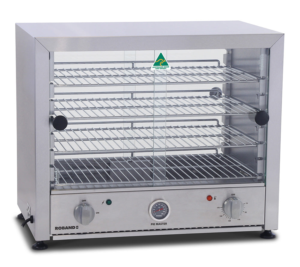 Designed to hold and attractively display cooked pies, sausage rolls and pasties at the correct serving temperature. The modern stainless-steel body has adjustable feet. The cleverly designed display racks can be installed horizontally or at an angle. The PM50G has a 50-pie capacity and features sliding glass doors on both sides of the unit.